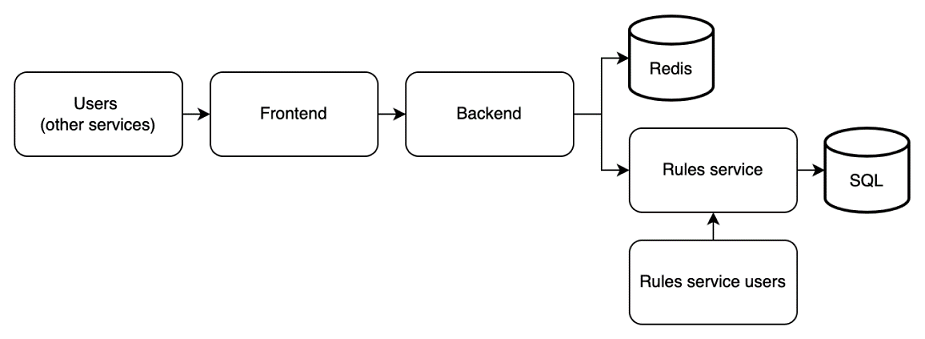 Figure 8.1 Initial high-level architecture of rate limiter. The frontend, backend, and Rules service all also log to a shared logging service; this is not shown here. The Redis database is usually implemented as a shared Redis service, rather than our service provisioning its own Redis database. The Rules Service users may make API requests to the Rules Service via a browser app. We can store the rules in SQL.