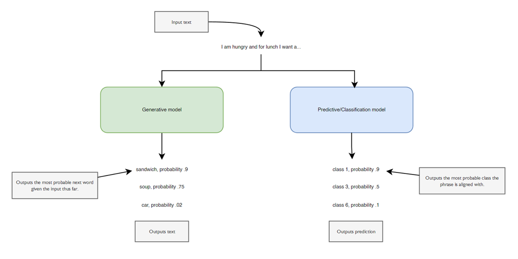 LLMs and GPTs are generative models. That means they are trained to generate rather than predict or classify content. To illustrate this further, consider Figure 2.1, which shows the difference between generative and predictive/classification models. Generative models create something from the input, whereas predictive and classifying models assign it.