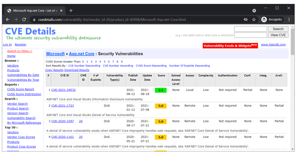 MITRE Corporation, the well-known research facility doing major work for the US government, is the initiator and sponsor of the CVE project (https://cve.org). Its goal is to identify and list common vulnerabilities, thus the name: Common Vulnerabilities and Exposures. The web site https://www.cvedetails.com/, independent of MITRE and the CVE project, but reusing its classification scheme, provides a searchable list of all reported vulnerabilities in various software products. For instance, https://www.cvedetails.com/vulnerability-list/vendor_id-26/product_id-3427/Microsoft-Internet-Information-Services.html lists all security vulnerabilities from Microsoft’s IIS (Internet Information Services), and https://www.cvedetails.com/vulnerability-list/vendor_id-26/product_id-42998/Microsoft-Asp.net-Core.html shows all security-related issues reported in ASP.NET Core (depicted in Figure 9.1).