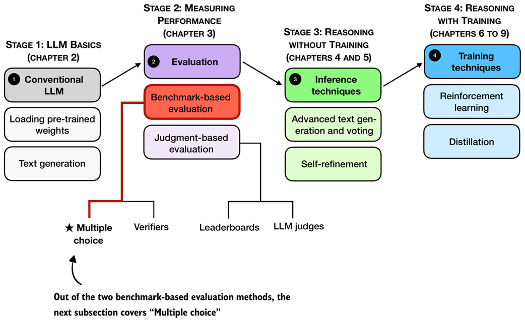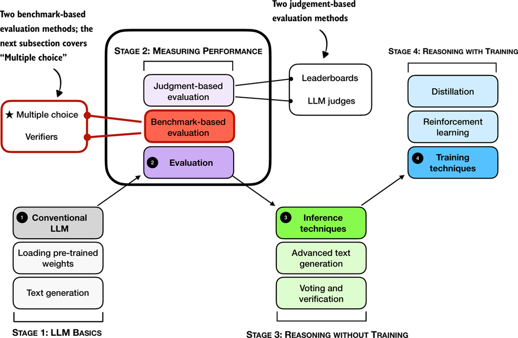 Figure F.1 A mental model of the topics covered in this book with a focus on the two broad evaluation categories, benchmark-based evaluation and judgment-based evaluation, covered in this appendix.