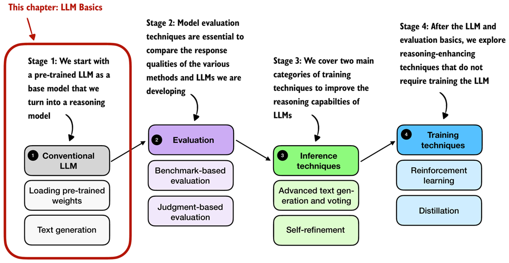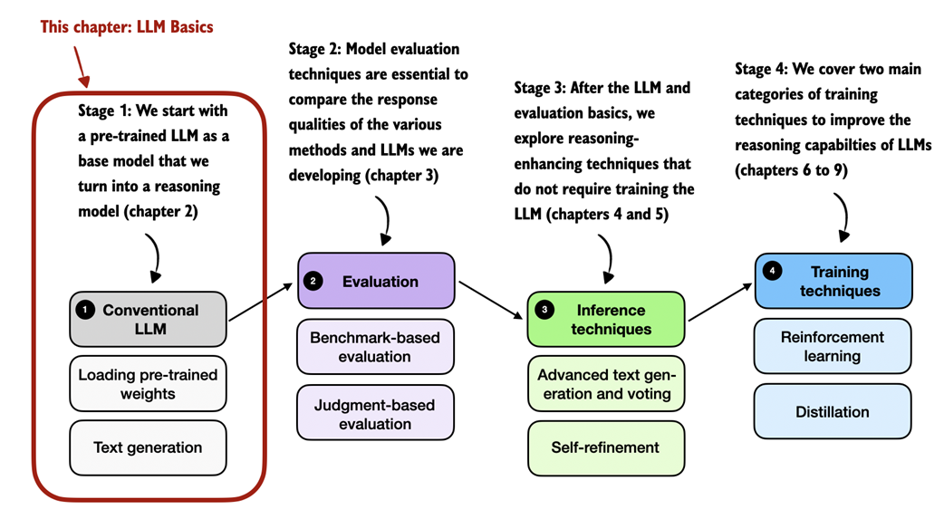 Figure 2.1 A mental model depicting the four main stages of developing a reasoning model. This chapter focuses on stage 1, loading a conventional LLM and implementing the text generation functionality.
