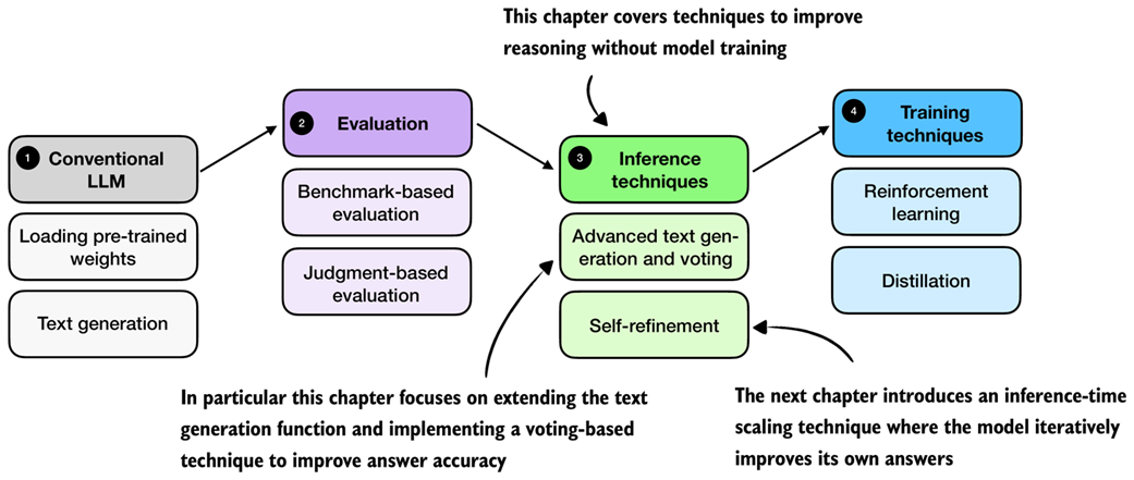 Figure 4.1 A mental model of the topics covered in this book. This chapter focuses on techniques that improve reasoning without additional training (stage 3). In particular, it extends the text-generation function and implements a voting-based method to improve answer accuracy. The next chapter then introduces an inference-time scaling approach where the model iteratively refines its own answers.