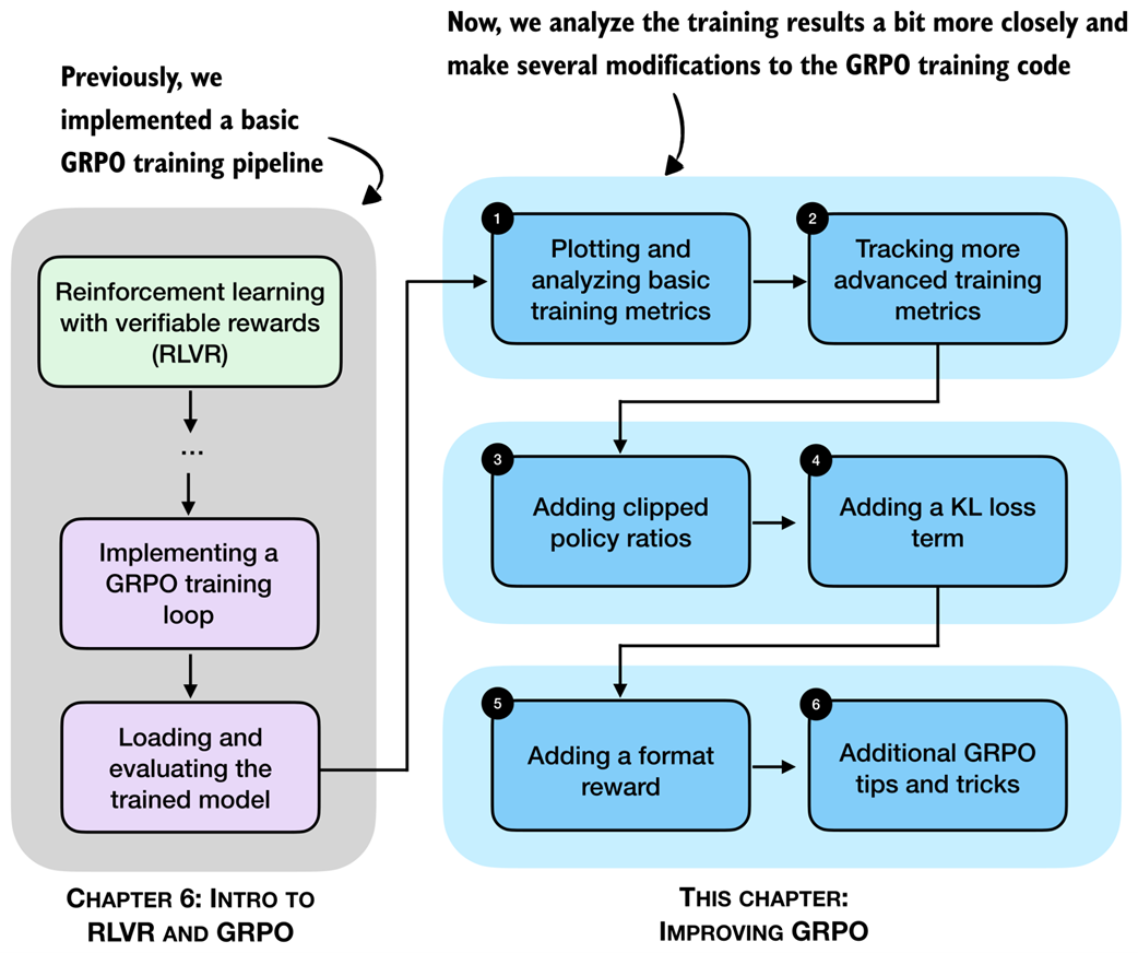 After implementing GRPO (group relative policy optimization) in the previous chapter, we now revisit and analyze the training run more thoroughly. Also, we discuss a collection of practical tips and algorithmic choices that become important in real training runs. These topics are summarized in the chapter overview in figure 7.2.