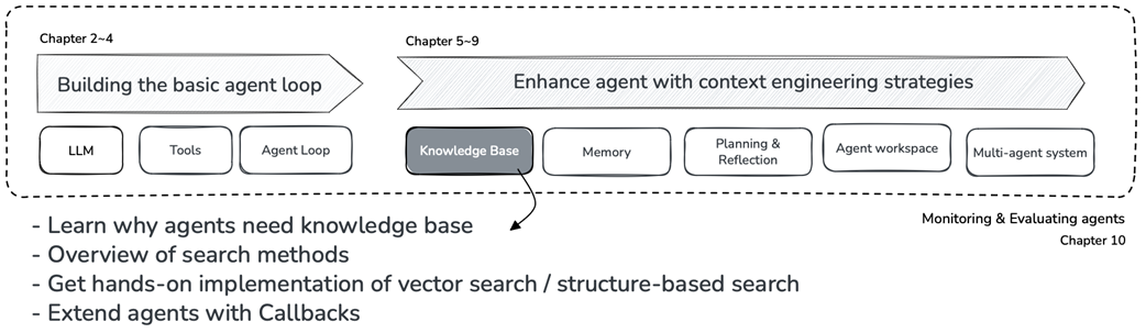 In Chapters 2 through 4, we built the foundation of an AI agent: connecting to LLMs, implementing tool use, and creating the agent loop. Now we enter a new phase. As figure 5.1 shows, we’ll now enhance our basic agent with context engineering strategies. This chapter tackles the first of these enhancements: building knowledge bases with RAG (Retrieval-Augmented Generation).
