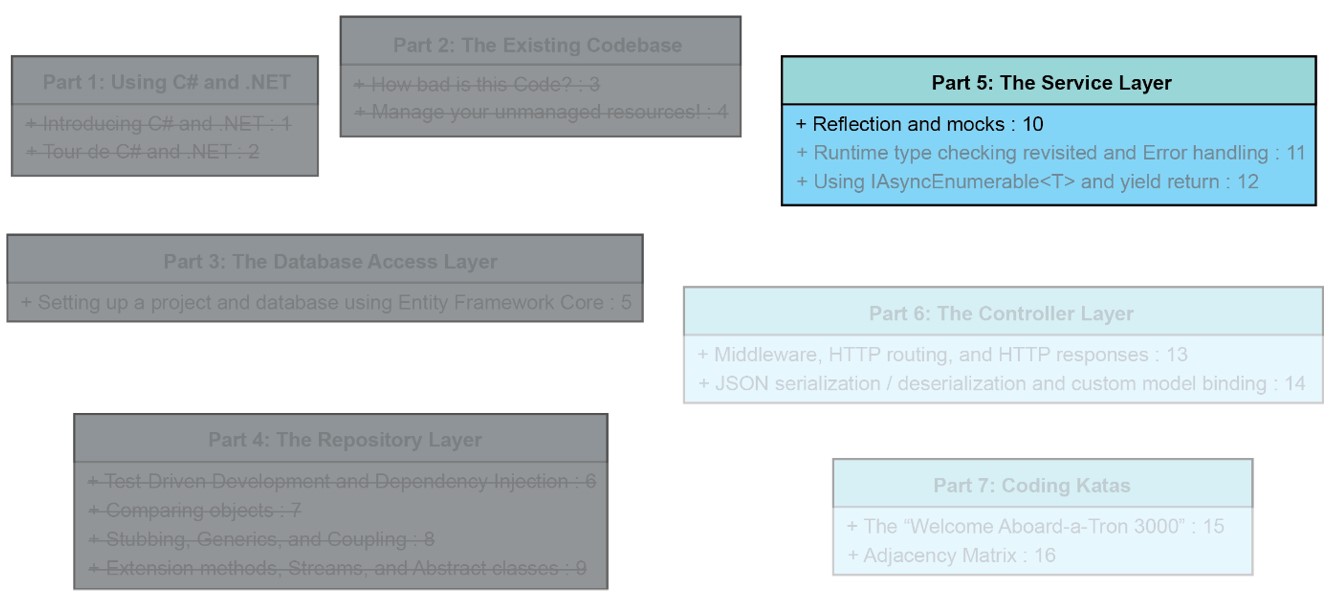 In chapters 6 through 9, we implemented the repository layer of our FlyingDutchmanAirlinesNextGen project. In this chapter, we refresh our knowledge of the Repository/Service pattern and implement (partially) two of the four required service classes: