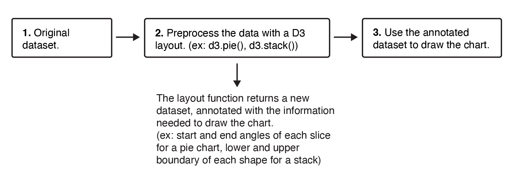 Layouts don’t draw the visualizations, nor are they referred to in the drawing code like shape generators. Instead, they are a preprocessing step that formats your data so that it’s ready to be displayed in the form you’ve chosen.