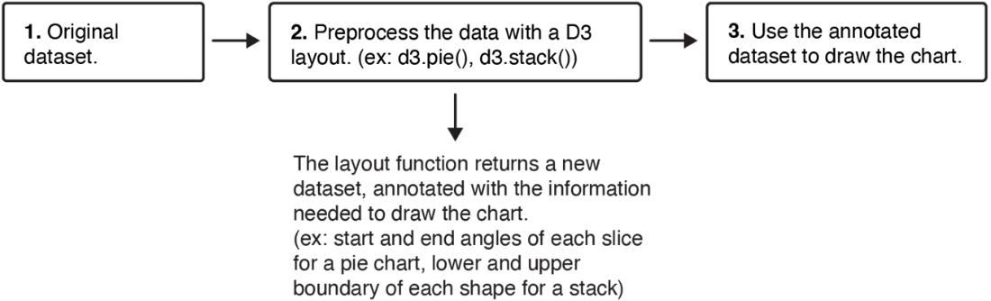 In the last chapter, we have discussed how D3 can calculate the d attribute of complex shapes like curves, areas, and arcs with its shape generator functions. In this chapter, we will take such shapes to another level with layouts. In D3, layouts are functions that take a dataset as an input and produce a new, annotated dataset as an output. This new dataset contains the attributes necessary to draw a specific visualization. For example, the pie layout calculates the angles of each slice of a pie chart and annotates the dataset with these angles. Similarly, the stack layout calculates the position of the piled shapes in a stacked bar chart or a streamgraph.