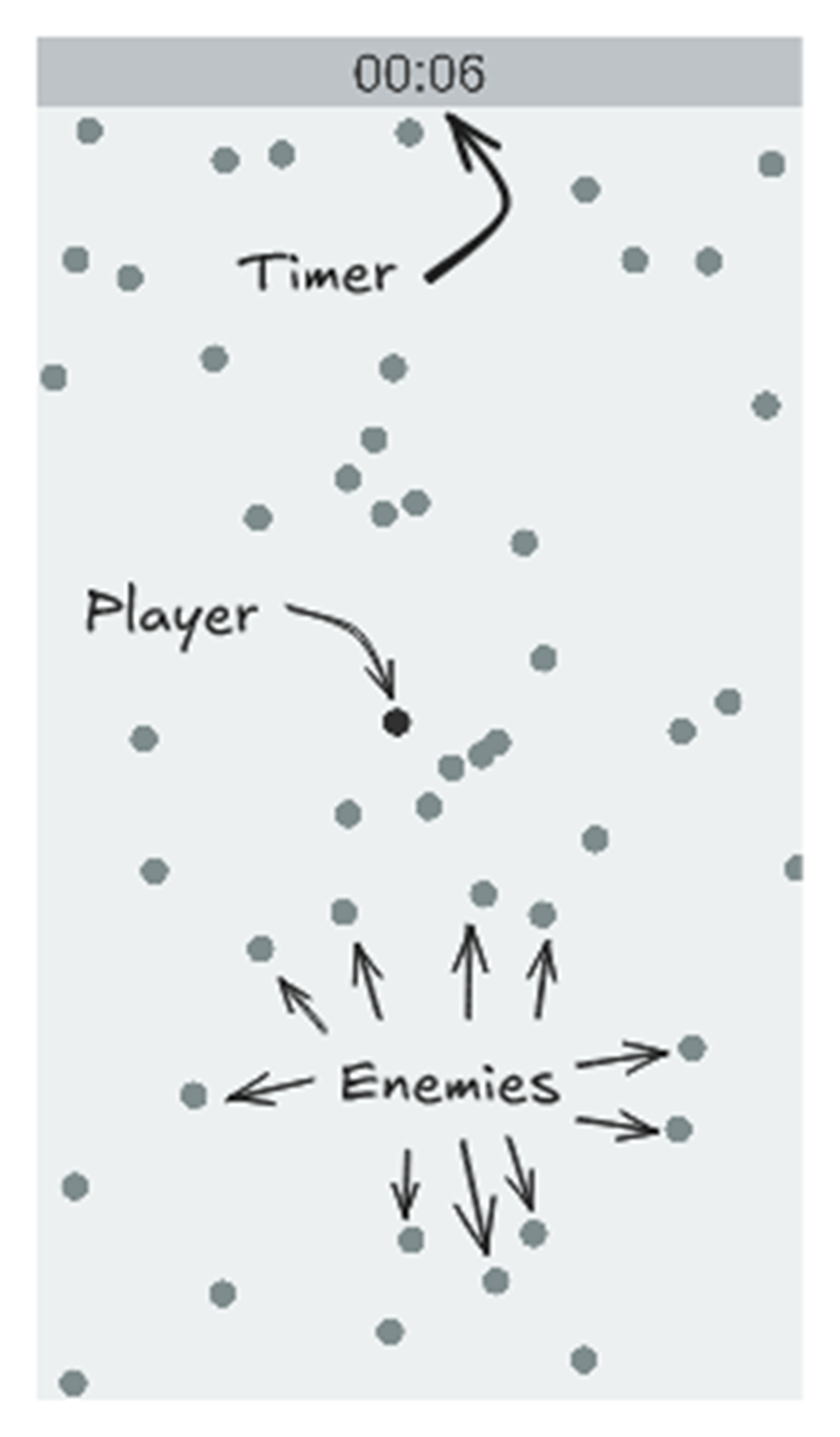The gameplay is simple: the user controls the player (the black dot) and tries to avoid enemies (the gray dots). If the player touches an enemy, the game is over. To keep things simple, the player won’t shoot anything. We are just avoiding enemies here.