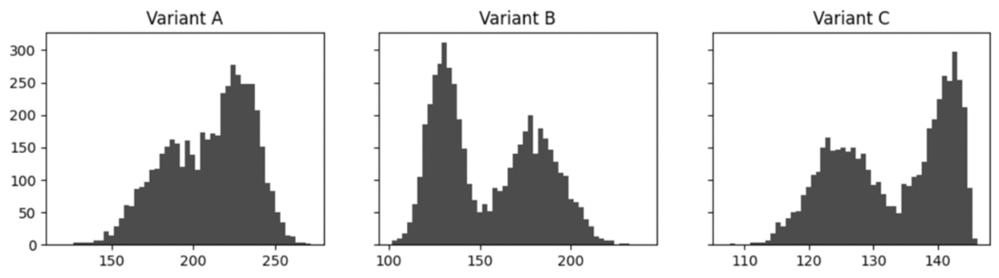 You are an analyst on a product analytics team at a software company. The product team is evaluating whether one of the new page versions on the app leads to customers completing a workflow faster. You were asked to conduct a between-subjects ANOVA to assess the results of an A/B/C test. In your diligence as an analyst, you start by exploring the distributions of data to check the assumption of normality. The distributions look like this: