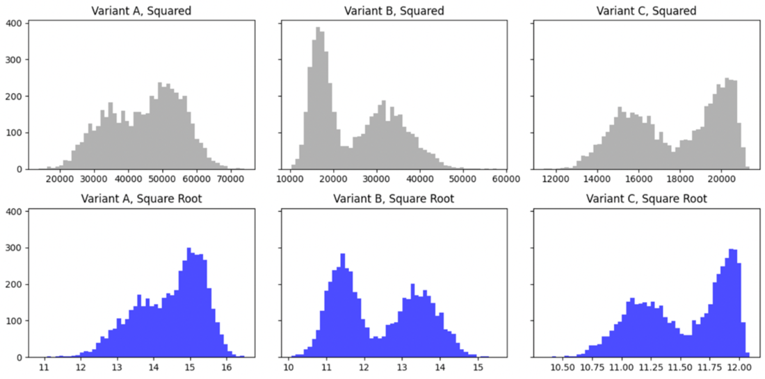 Figure 5.2 Square and square root transformations of the original bimodal distributions.