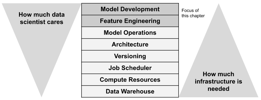 The focus is deliberate. First, many excellent books already exist about these topics. Also mature modeling libraries like TensorFlow and PyTorch come with a plethora of in-depth documentation and examples. Second, as depicted in Figure 9.1, these topics tend to be the core areas of expertise of professional data scientists and machine learning engineers whereas the lower layers are not. To boost the day-to-day productivity of data scientists effectively, it makes sense to help them where help is needed the most: the lower layers of the stack.
