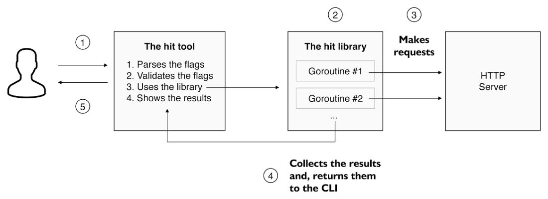 As you can see in Figure 5.1, a user runs the hit tool with a few command-line arguments (not shown in the figure) to check how an HTTP server performs. The tool makes the requests to the HTTP server, aggregates response statistics, and shows the result to the user.
