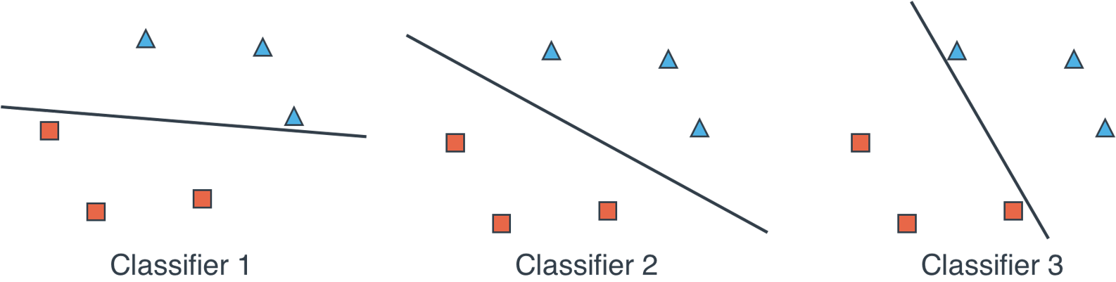 In Chapters 5 we learned linear classifiers, or perceptrons. With two-dimensional data, these are defined by a line that separates a dataset consisting of points with two labels. However, you may have noticed that many different lines can separate a dataset, and this raises the following question: How do you know which is the best line? In figure 11.1 I show you three different linear classifiers that separate this dataset. Which one do you prefer, classifier 1, 2, or 3?