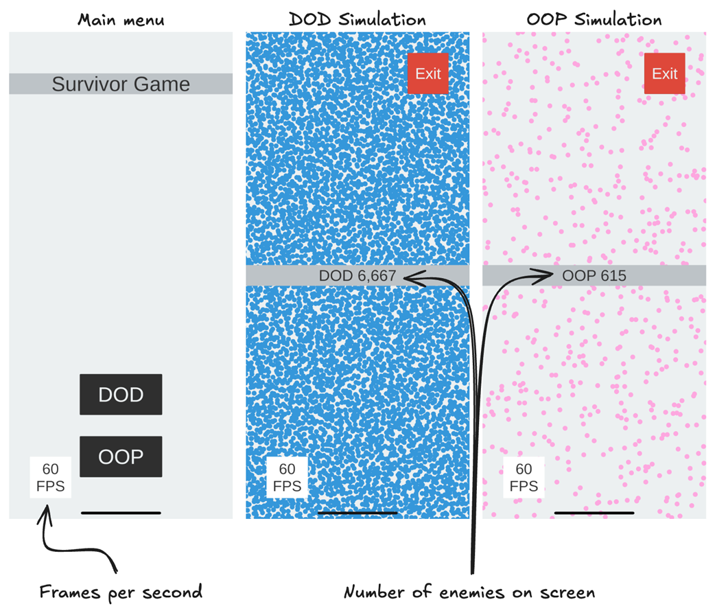 First, we’ll set up our testing environment. Then, we’ll make an OOP version of our simple survival game and slightly modify the DOD version. Finally, we’ll run both and see which one allows us to have more enemies on the screen while maintaining 60fps.