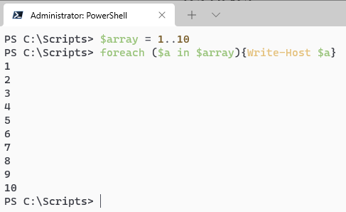PS C:\Scripts> foreach ($a in $array) {Write-output $a}