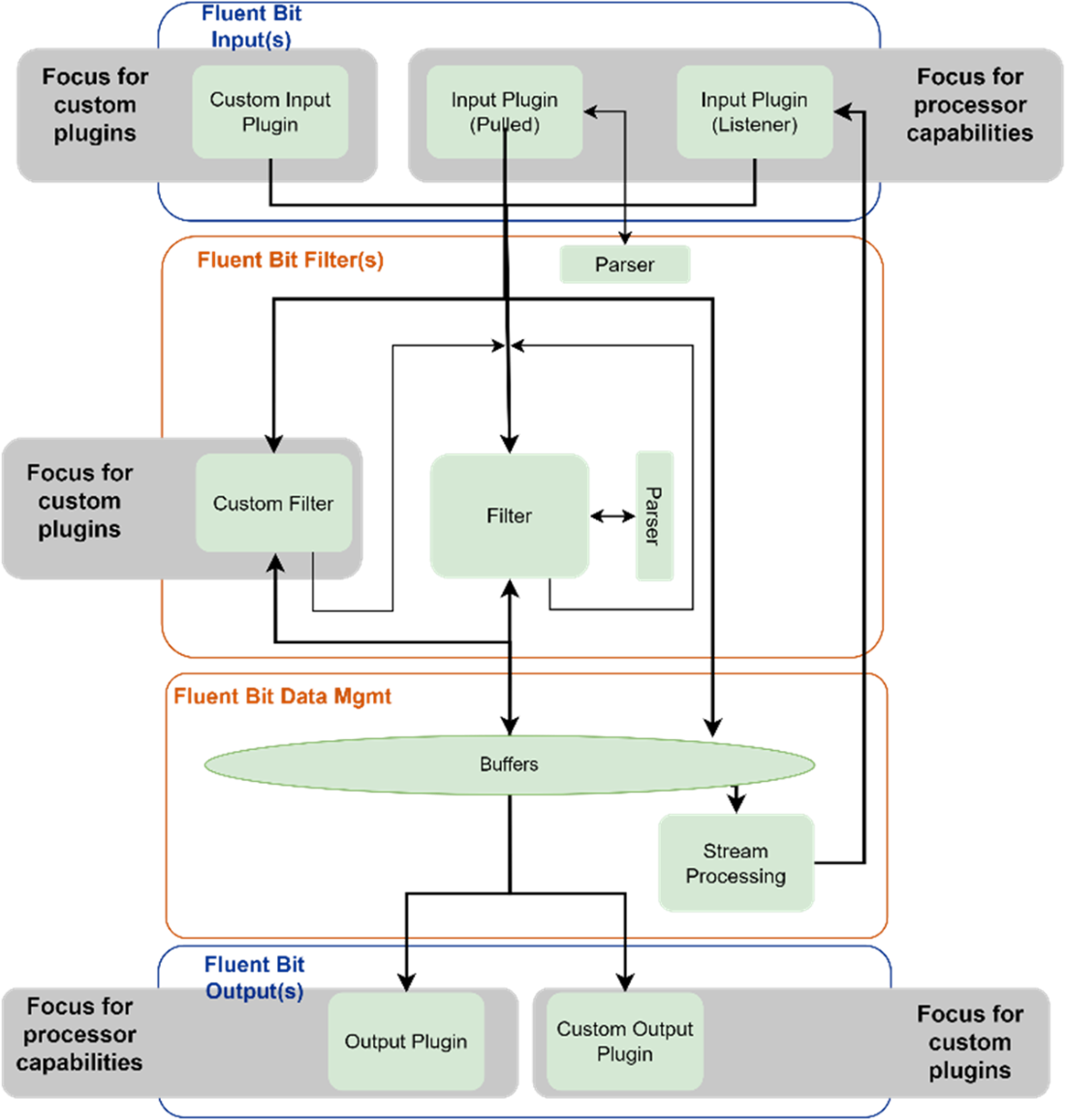 Figure 9.1 Representation of Fluent Bit from a logical architecture showing where custom plugins can be used, along with the consideration of the processor feature that allows us to change the behavior of existing plugins.
