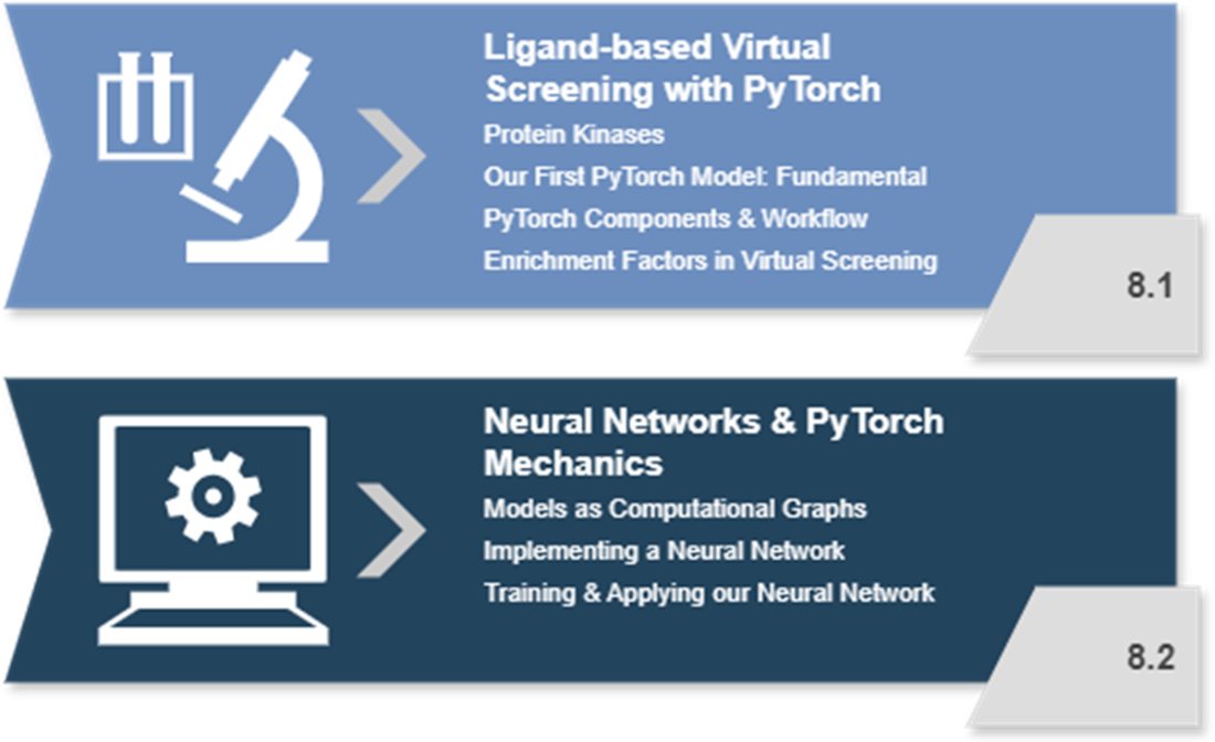 This chapter marks a segway across several domains. In the first half of the book, we covered a sizeable swath of machine learning methods and how to apply them, typically using Scikit-Learn, to problems in drug discovery with a focus on ligand-based applications. In the second half, we will transition to advanced methods that underly deep learning. To apply these methods, we’ll expand our tool usage to PyTorch, a well-known and popular deep learning framework. Lastly, we’ll increase the scope of our projects to cover structure-based applications, e.g., how a ligand interacts with a known protein structure.