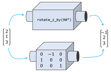 We could describe a linear transformation as “rotation counterclockwise by 90 degrees about the z-axis,” or we could describe it using the right nine numbers. Either way, we get an imaginary “machine” that behaves the same way: taking 3D vectors as inputs and producing rotated 3D vectors as outputs. The implementations might be different, but the “machines” would produce indistinguishable results.