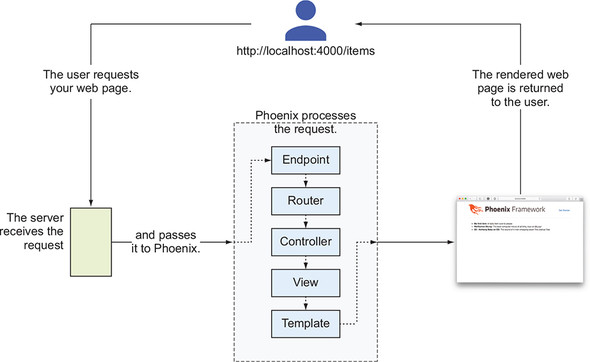 Figure 9.1 shows how a user request travels through Phoenix. You can trace a user request through the server, endpoint, router, controller, view, and template, back to the user. With the exception of the endpoint, you’ll touch on each of these areas in this chapter.