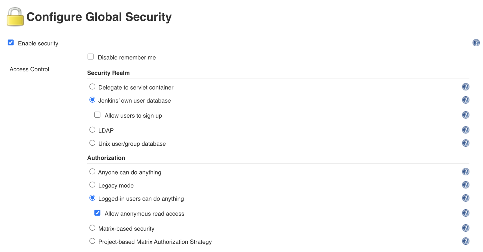 The current configuration of Jenkins allows not-logged users to read access and logged users to access almost everything. To override this default behavior, head to the “Configure Global Security” section from “Manage Jenkins”:
