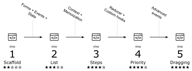 In this project, we're building a task manager. By that term, we mean a slightly more complex variant of a todo-list. The task manager at first consists of a simple todo-list implemented as cards that can be started and completed. We then add in sub-steps to each task, so the user can add some finer details to their tasks at hand. We're then adding in the option of changing the order of the steps in each task, first only using buttons, but secondly also using drag and drop. It is that last bit, the drag 'n drop part, that's going to be quite tricky to complete. You can see this development in figure 13.1, where we are going to use advanced events to get to the final step 5.