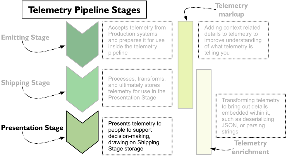 Figure 5.1 The telemetry pipeline stages with the Presentation Stage last. The Presentation Stage consumes storage from the Shipping Stage, and presents it to people to support decisions. The Presentation Stage has access to all of the Shipping Stage storage, allowing it to enrich telemetry beyond what the previous two stages were able to provide