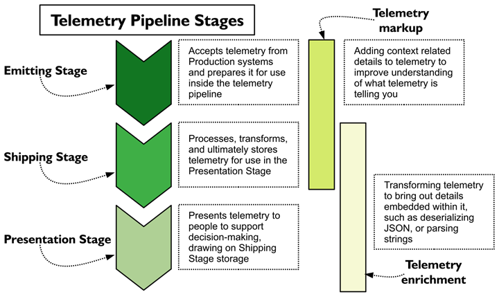 Figure 1: Telemetry system pipeline stages with their definitions. The Emitting Stage packages telemetry for the Shipping Stage, which processes, transforms, and stores telemetry to be consumed by the Presentation Stage. Markup adds context-related telemetry during the Emitting and Shipping stages, where enrichment transforms telemetry to improve its usefulness during the Shipping and Presentation stages.)