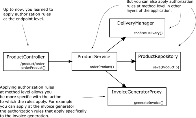 Figure 16.1 Global Method Security enables you to apply authorization rules at any layer of your application. This approach allows you to be more granular and apply the authorization rules specifically to the subject to which they apply.