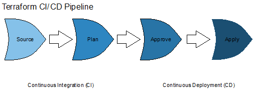 Figure 12.1 A CI/CD pipeline for Terraform deployments with four stages. Changes to configuration code stored in a VCS source repository triggers a “terraform plan” to be run. If the plan succeeds, a manual approval is required before the changes are applied into production.